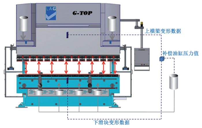 為了保證高精度的鈑金折彎,在折彎機的上橫梁(滑塊)和下橫梁(工作臺)安裝了傳感器(見圖5),在工作狀態(tài)時,將上、下橫梁的變形量實時準確地反饋到數(shù)控系統(tǒng)(PC),數(shù)控系統(tǒng)經(jīng)過計算比對后,輸出相應的補償值驅動補償油缸進行動態(tài)補償,以獲得滿意的制件精度。