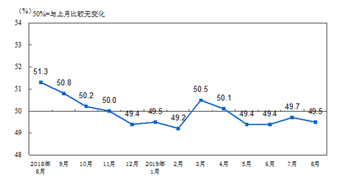中國物流與采購聯合會、國家統計局服務業調查中心8月31日發布,8月份中國制造業采購經理指數(PMI)為49.5%,較上月下降0.2個百分點,這也是中國制造業PMI連續4個月處于榮枯線以下。分項指數顯示,8月市場需求趨于穩定,企業生產活動有所波動,原材料市場價格下降,企業經營基本穩定。綜合來看,制造業指數小幅下降,新動能平穩增長。