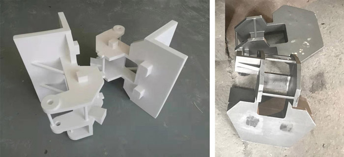 在模具開發前期,由于材料收縮、變形、成型工藝合理性等情況的不可預見性,模具開發往往需要幾次的尺寸調整,增加了模具的開發成本,生產周期很難確定。采用3D打印技術將模具生產的蠟模、砂型等打印出來,先進行成型性試驗,通過試驗確定最佳的模具尺寸、反變形量、合理成型工藝等,這種方式既保證了前期小批零件的供給,又大大降低模具開發成本和縮短模具開發周期。模具開發時間將控制在30個工作日內,首批零件20天內提供,大批量在45個工作日內提供。本體為變形和成型工藝無法預見的典型案例,本體SLS打印蠟模和硅溶膠精密鑄件毛坯如下圖所示。