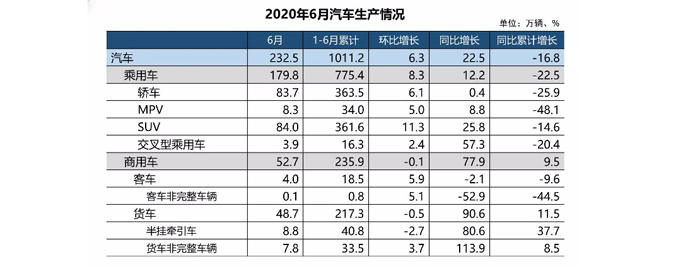 中國汽車工業協會今天下午召開的信息發布會最新數據顯示,2020年6月,我國汽車產銷延續了回暖勢頭,當月產銷量環比和同比保持增長,其中商用車同比增速更為明顯。6月,我國汽車產銷分別達到232.5萬輛和230.0萬輛,環比增長6.3%和4.8%,同比增長22.5%和11.6%。