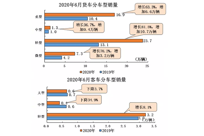 6月,商用車產銷52.7萬輛和53.6萬輛,產量環比下降0.1%,銷量增長3.1%,同比增長77.9%和63.1%。在商用車主要品種中,與上月相比,貨車產量微降,銷量呈小幅增長,客車產銷均呈增長;與上年同期相比,客車產銷略有下降,貨車產銷增速依然顯著。