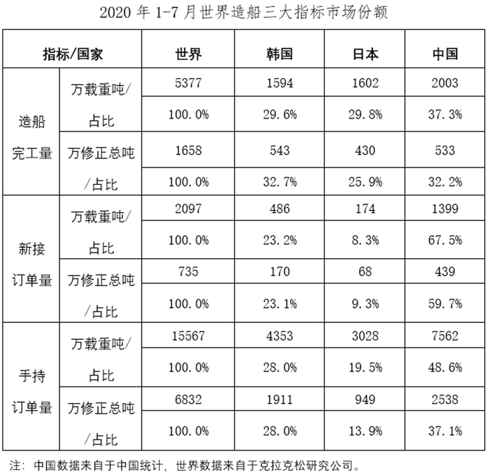 2020年1-7月份,我國造船完工量降幅收窄,新承接船舶訂單和手持訂單量同比下降。重點監測企業工業總產值等主要經濟指標繼續下降。