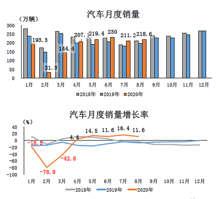 1-8月,汽車產銷1443.2萬輛和1455.1萬輛,同比分別下降9.6%和9.7%,降幅與1-7月相比,分別收窄2.2和3.0個百分點。