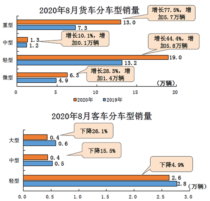 1-8月,商用車產銷325.6萬輛和326.3萬輛,同比分別增長19.3%和17.3%,增速比1-7月提升2.9和3.0個百分點。在商用車主要品種中,與上年同期相比,客車產銷均呈下降,貨車保持較快增長。
