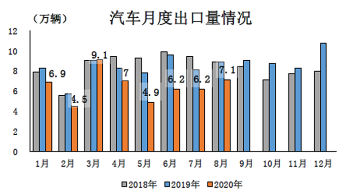 1-8 月 汽車企業出口51.9萬輛,同比下降21.0%,降幅比1-7月收窄0.2個百分點。分車型看,乘用車出口38.7萬輛,同比下降14.9%;商用車出口13.3萬輛,同比下降34.8%。