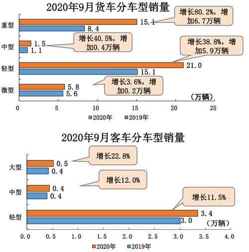 9月,商用車產(chǎn)銷分別完成47.9萬輛和47.7萬輛,環(huán)比分別增長12.7%和10.6%;同比分別增長39.0%和40.3%。細(xì)分車型來看,客車、貨車均呈現(xiàn)增長,其中貨車今年第6次刷新當(dāng)月歷史記錄,從而支撐商用車今年也實現(xiàn)第6次刷新當(dāng)月歷史記錄。從貨車分車型來看,輕型貨車和重型貨車的增長貢獻(xiàn)最為明顯。