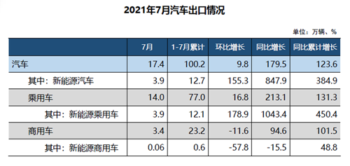 7月,汽車企業(yè)出口17.4萬輛,環(huán)比增長9.8%,同比增長1.8倍,再創(chuàng)歷史新高。分車型看,乘用車本月出口14.0萬輛,環(huán)比增長16.8%,同比增長2.1倍;商用車出口3.4萬輛,環(huán)比下降11.6%,同比增長94.6%。