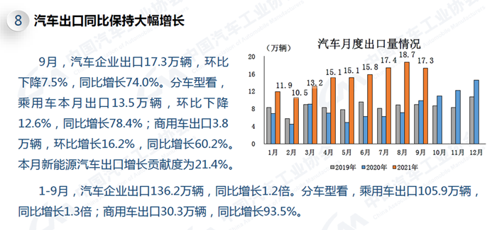 1-9月,汽車產銷1824.3萬輛和1862.3萬輛,同比增長7.5%和8.7%,增速比1-8月繼續回落。