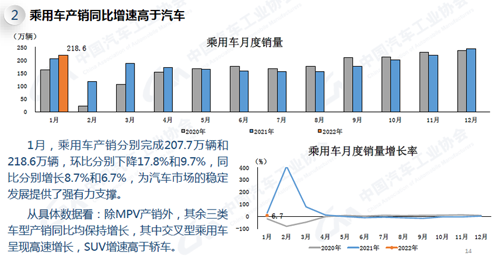 1月,乘用車產(chǎn)銷207.7萬輛和218.6萬輛,環(huán)比下降17.8%和9.7%,同比增長8.8%和6.7%。在乘用車主要品種中,與上月相比,四大類乘用車品種產(chǎn)銷均呈下降,其中多功能乘用車(MPV)和交叉型乘用車降幅更為明顯;與上年同期相比,多功能乘用車(MPV)產(chǎn)銷小幅下降,其他三大類乘用車品種呈不同程度增長,其中交叉型乘用車增速更快。
