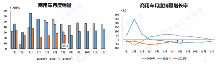 7月,商用車產(chǎn)銷環(huán)比下降6.2%和12.5%,同比下降22.9%和21.5%,降幅比上月有所收窄。在商用車主要品種中,與上月相比,貨車和客車產(chǎn)量小幅下降,銷量降幅較為明顯;與上年同期相比,客車和貨車產(chǎn)銷依舊延續(xù)了較快下降趨勢(shì)。