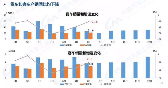 1-7月,商用車產(chǎn)銷同比下降36.9%和39.3%。在商用車主要品種中,與上年同期相比,客車和貨車產(chǎn)銷均呈較快下降,其中貨車降幅更為明顯。