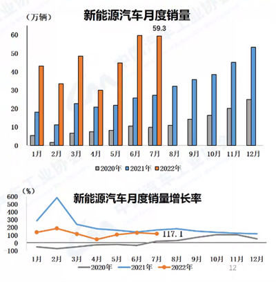 1-7月,新能源汽車產(chǎn)銷增長(zhǎng)均為1.2倍,市場(chǎng)占有率達(dá)到22.1%。