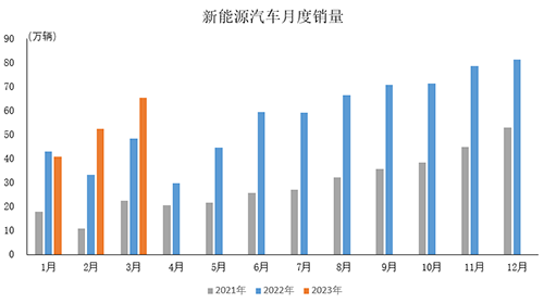 2023年3月,新能源汽車產銷環比分別增長22%和24.4%,同比分別增長44.8%和34.8%。2023年1-3月,新能源汽車產銷同比分別增長27.7%和26.2%,市場占有率達到26.1%。