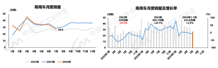 7月,商用車產銷分別完成25.6萬輛和26.8萬輛,環比分別下降22.4%和20.4%,同比分別下降10.5%和6.6%。在商用車主要品種中,與上月相比,客車和貨車產銷均呈兩位數下降;與上年同期相比,客車和貨車產銷均呈不同程度下降。
