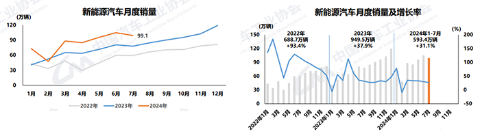 1-7月,新能源汽車產銷累計完成591.4萬輛和593.4萬輛,同比分別增長28.8%和31.1%,新能源汽車新車銷量達到汽車新車總銷量的36.4%。在新能源汽車主要品種中,與上年同期相比,三大類新能源汽車品種產銷均呈不同程度增長。
