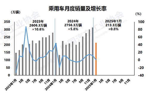 中國汽車工業協會最新數據顯示,2025年1月,汽車產量實現小幅增長,銷量較同期只微降,行業迎來平穩開局。其中,乘用車延續良好表現,產銷同比雙增;商用車市場需求偏低,銷量同比有所下降;新能源汽車表現亮眼。當月,汽車產銷分別完成245萬輛和242.3萬輛,環比分別下降27.2%和30.5%,產量同比增長1.7%、銷量同比下降0.6%。