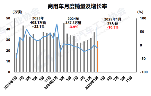 1月,商用車產銷分別完成29.9萬輛和29萬輛,環比分別下降17.2%和21.2%,同比分別下降8.6%和10.3%。在商用車主要品種中,與上月相比,客車和貨車產銷均呈兩位數下降;與上年同期相比,客車產銷小幅增長,貨車產銷呈兩位數下降。1月,在貨車細分品種中,與上月相比,四大類貨車品種產銷均呈不同程度下降。