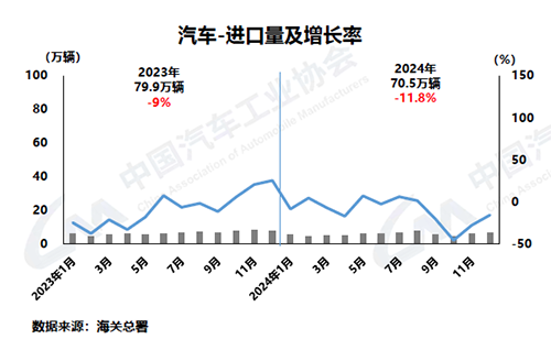 2024年,汽車進口70.5萬輛,同比下降11.8%;出口640.7萬輛,同比增長22.7%。