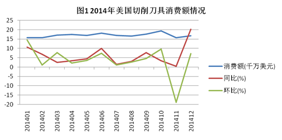 2014年美國切削刀具消費額達(dá)到20.4億美元,同比增長5.9%,呈現(xiàn)波動上升的趨勢。2014年月度消費額均值為1.7億美元,較2013年增長946萬美元。