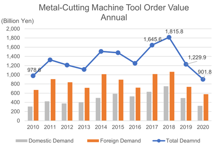 對于日本經濟及日本機床工業運行情況,Kazuo YUHARA介紹道,2016年到2019年,日本經濟因良性循環而實現增長,2020年受疫情影響呈現負增長。2011年到2019年,資本投資連續9年增長,但在2020年,受疫情影響,出現10年來的首次負增長。由于強勁的資本投資,2017年和2018年的日本機床訂單大幅增長,并于2018年首次超過1.8萬億日元。2019年,全球經濟前景不明朗,導致投資狀況惡化。2020年,經濟環境受到疫情的進一步打擊,并于2020年5月觸底,此后逐步復蘇。