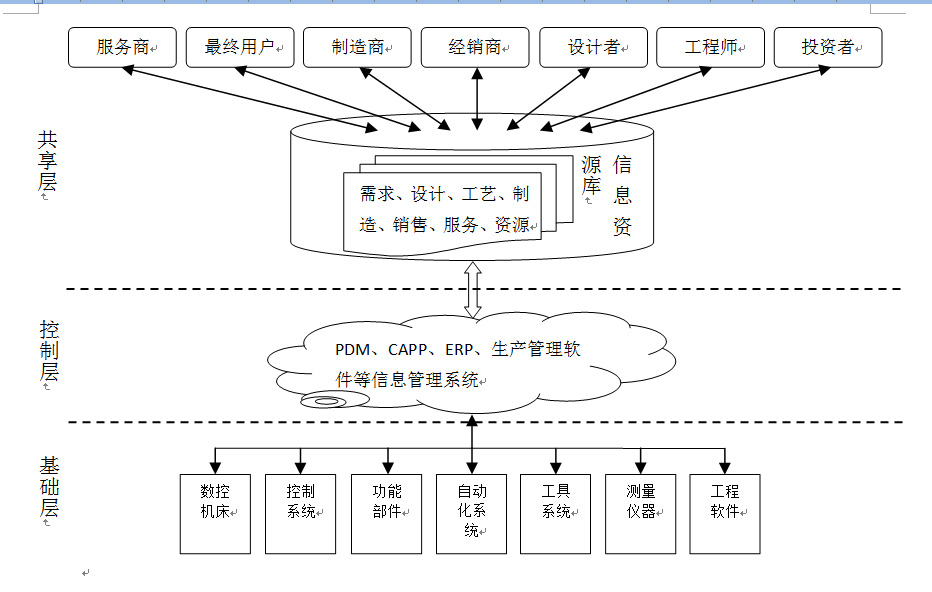 在具有高效、自動化和綠色特征的制造軟硬件基礎(chǔ)層之上,就是為了實現(xiàn)對實體機床和制造系統(tǒng)進行管理和信息交換的控制層。該層面基于計算機、互聯(lián)網(wǎng)和信息技術(shù)的成果,實現(xiàn)對基礎(chǔ)軟硬件層的實時控制和資源優(yōu)化管理,為更高層次共享硬件資源和交換信息提供后臺處理和支撐。該層技術(shù)和軟件向下可延伸到基礎(chǔ)層的控制、測量和反饋環(huán)節(jié),向上與信息共享層交接。這部分目前屬于工業(yè)4.0概念中基礎(chǔ)控制部分涉及的范疇。