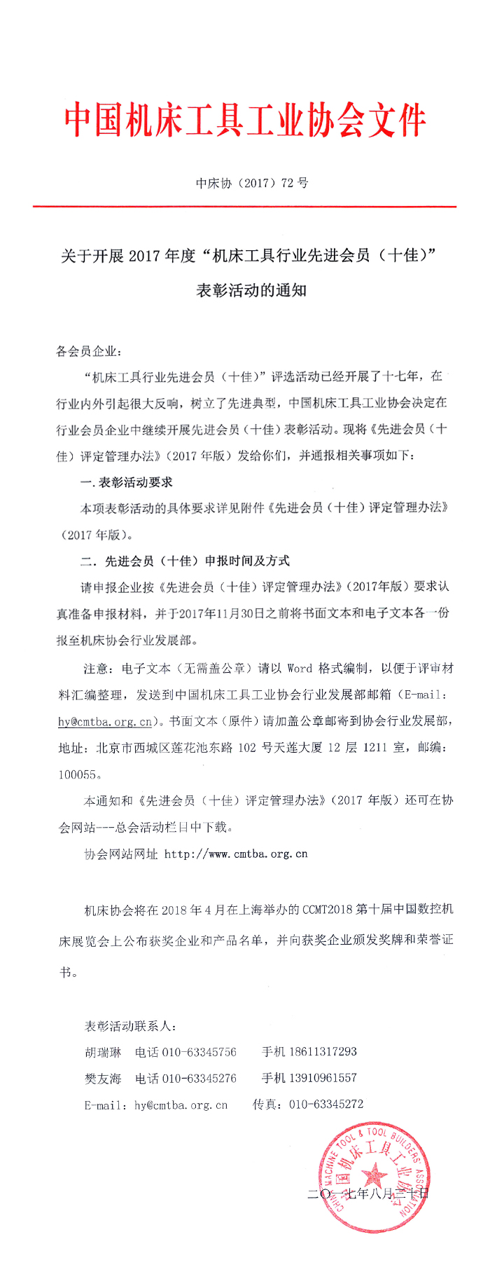 【關于開展2017年度“機床工具行業先進會員(十佳)”表彰活動的通知】