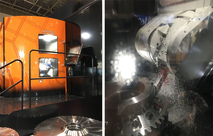在本次展會上大隈和馬扎克就展出了這樣的超級復(fù)合機床。大隈的MUTUS U400集成了車銑加工、激光淬火、齒輪加工和檢測等功能,將跨界工藝集成在一臺機床上,大幅減少了零件的加工工序、提高了加工精度和效率。馬扎克展出的e-1250V/8S復(fù)合加工機床,集車削加工、五軸聯(lián)動銑削加工、滾齒加工和測量等功能于一身,一次裝卡可加工完成極其復(fù)雜的零件。