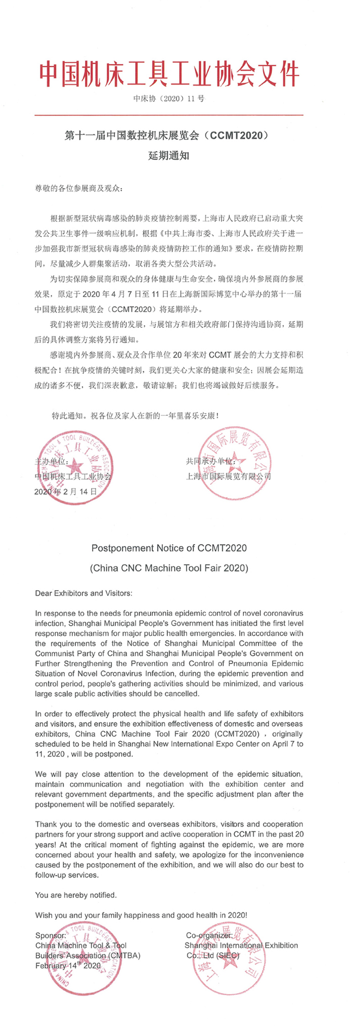 第十一屆中國數控機床展覽會(CCMT2020)延期通知