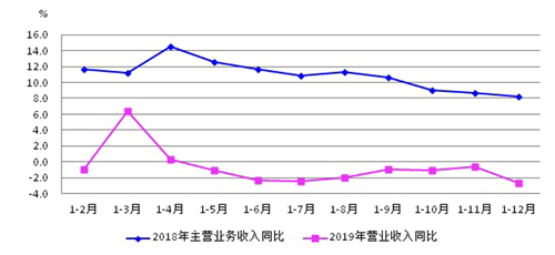 圖2為2019年1-12月份營業收入同比變化與2018年主營業務收入同比變化的對比。由圖可見,2018年4月份達到14.6%的高點之后波動下行,但全年仍保持了8.3%的同比增長,而2019年除1-3月、1-4月為累計同比增長之外,其余各月均為同比降低,行業下行壓力明顯大于2018年。