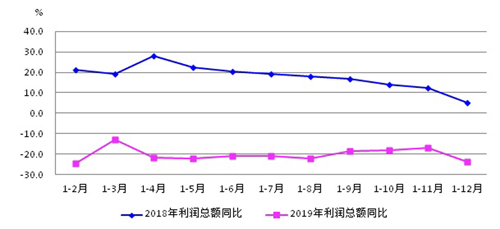 圖4為2019年1-12月份機床工具行業利潤總額同比變化與2018年利潤總額同比變化的對比。由圖可見,2018年1-4月累計利潤總額同比增長達到峰值,其后逐月下行,但全年各月利潤總額累計同比始終保持增長。而2019年各月利潤總額累計同比均為降低。