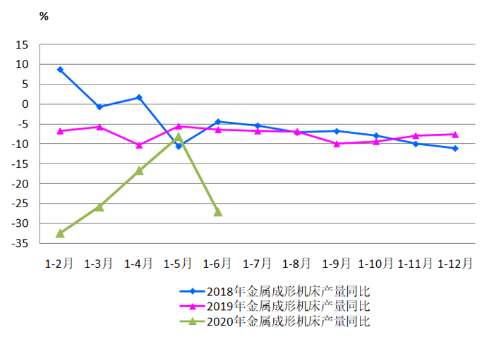 協會重點聯系企業2020年1-6月累計,金屬切削機床產量同比下降2.5%,較今年1-3月同比降幅(-29.8%)收窄27.3個百分點;金屬成形機床產量同比下降13.8%,較今年1-3月同比降幅(-37.4%)收窄23.6個百分點。大體上與國統局數據變化趨勢一致。