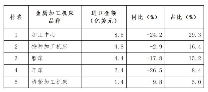 金屬加工機床進口額29.0億美元,同比下降24.1%,降幅較一季度(-32.3%)收窄7.1個百分點。其中,金屬切削機床進口額24.1億美元,同比下降20.4%,降幅較一季度(-27.4%)收窄7個百分點;金屬成形機床進口額4.9億美元,同比下降38.4%,降幅較一季度(-48.5%)收窄10.1個百分點。
