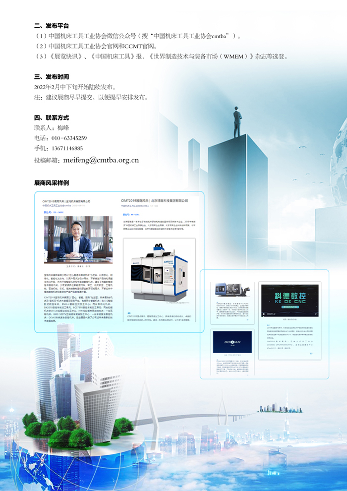 為加強(qiáng)對CCMT2022展商、展品的宣傳報道力度,展會主辦方中國機(jī)床工具工業(yè)協(xié)會將在其主辦的全媒體平臺(微信公眾號、網(wǎng)站、《中國機(jī)床工具》報、《展覽快訊》、《WMEM》雜志等)繼續(xù)設(shè)立“展商風(fēng)采”板塊。