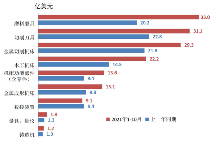 進口方面,2021年1-10月總體呈現明顯增長的態勢。機床工具商品進口115.2億美元,同比增長23.1%。其中:金屬加工機床進口額62.0億美元,同比增長27.1%(其中,金屬切削機床進口額51.8億美元,同比增長29.1%;金屬成形機床進口額10.2億美元,同比增長18.2%)。切削刀具進口額13.9億美元,同比增長16.7%。磨料磨具進口額6.3億美元,同比增長26.8%。
