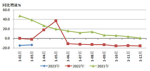 圖1是2023年1-3月和2022年、2021年重點(diǎn)聯(lián)系企業(yè)營(yíng)業(yè)收入同比增速情況的對(duì)比。