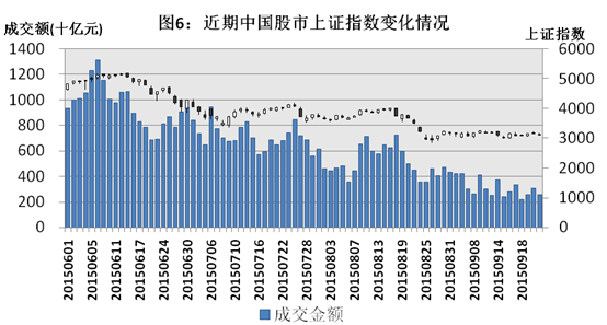首先說(shuō)股市。今年3-6月,上證綜指累計(jì)上漲了70%,股市泡沫迅速積累。圖6是上證指數(shù)二、三季度的變化情況,由圖看出,自6月中旬以來(lái),股市經(jīng)歷了三輪調(diào)整,其中前兩輪調(diào)整沒(méi)有引起國(guó)際影響,但是8月下旬的第三輪調(diào)整則產(chǎn)生了全球性影響。中國(guó)政府及時(shí)采取有力措施,通過(guò)多種渠道向市場(chǎng)提供流動(dòng)性,防止了系統(tǒng)性金融風(fēng)險(xiǎn)的發(fā)生。至9月上旬,股市調(diào)整已大致到位,進(jìn)入了自我修復(fù)和自我調(diào)整的階段。