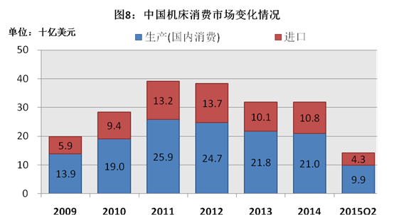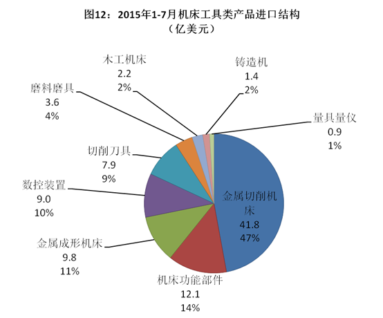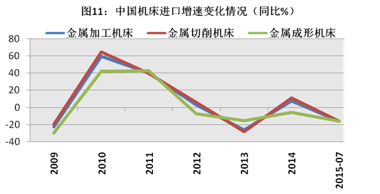 11是近年來(lái)中國(guó)金屬加工機(jī)床進(jìn)口增速的同比變化情況,可以看出,機(jī)床進(jìn)口增速在2010年達(dá)到59.8%的高點(diǎn),以后3年連續(xù)下滑,至2013年降為-26%,去年增速反彈至7.6%,今年1-7月又回到了負(fù)增長(zhǎng)狀態(tài)(-15.9%)。