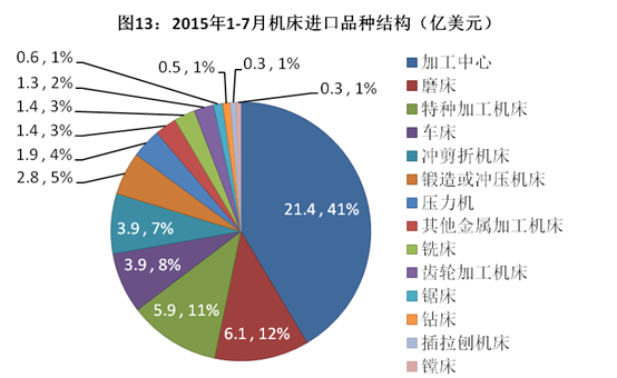 13是進(jìn)口機(jī)床按產(chǎn)品種類分布的情況,數(shù)據(jù)顯示,進(jìn)口額較大的品種依次順序?yàn)榧庸ぶ行摹⒛ゴ病⑻胤N加工機(jī)床、車床和沖剪折機(jī)床,以上五類機(jī)床進(jìn)口額為41.1億美元,占比79.7%