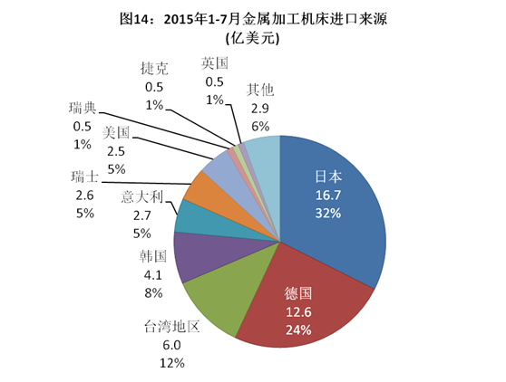 14是進(jìn)口機(jī)床按進(jìn)口來(lái)源分布的情況,數(shù)據(jù)顯示,進(jìn)口額較大的國(guó)家和地區(qū)依次順序?yàn)槿毡尽⒌聡?guó)、臺(tái)灣地區(qū)、韓國(guó)和意大利,以上來(lái)源的進(jìn)口總額達(dá)到42.1億美元,占比81.6%
