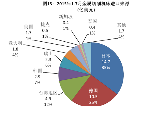 15是金屬切削機(jī)床按進(jìn)口來(lái)源分布的情況,數(shù)據(jù)顯示,進(jìn)口額較大的國(guó)家和地區(qū)依次順序?yàn)槿毡尽⒌聡?guó)、臺(tái)灣地區(qū)、韓國(guó)和瑞士,以上來(lái)源的進(jìn)口總額達(dá)到35.3億美元,占比84.4%