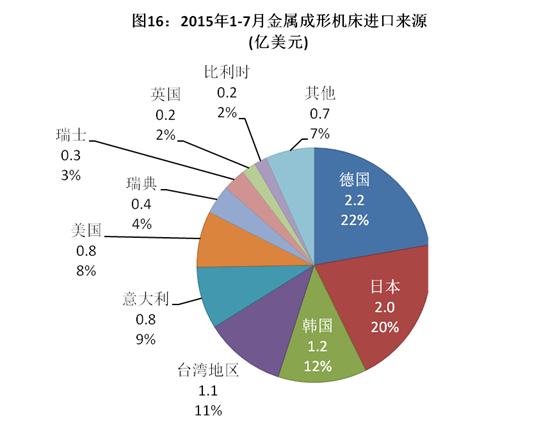 16是金屬成形機(jī)床按進(jìn)口來(lái)源分布的情況,數(shù)據(jù)顯示,進(jìn)口額較大的國(guó)家和地區(qū)依次順序?yàn)榈聡?guó)、日本、韓國(guó)、臺(tái)灣地區(qū)和意大利,以上來(lái)源的進(jìn)口總額達(dá)到7.3億美元,占比74.5%