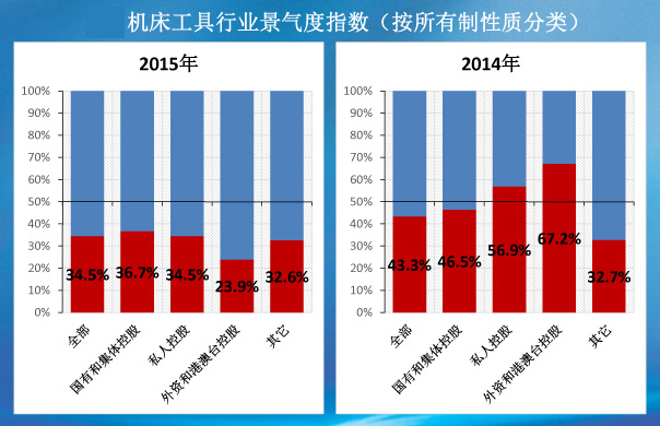 從分行業的景氣度情況看,2015年各分行業的景氣度指數均低于2014年。其中,金屬切削機床為36%,與2014年相比小幅下降3個百分點;金屬成形機床為33.3%,與2014年相比陡降30.4個百分點(降幅達47.7%);工量具為21.4%,與2014年相比陡降29.3個百分點(降幅達57.8%);功能部件和數控系統為31%,與2014年相比大幅下降15.8個百分點(降幅達33.8%)。景氣度指數下降幅度由大到小的排序分別是金屬成形機床、工量具、功能部件與數控系統和金屬切削機床。以上分行業指數和對比情況基本符合行業市場和經濟運行的實際趨勢。
