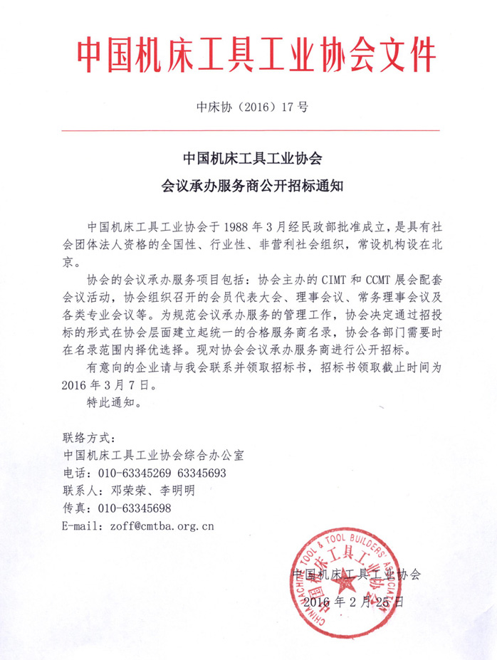 中國機(jī)床工具工業(yè)協(xié)會(huì)會(huì)議承辦服務(wù)商公開招標(biāo)通知