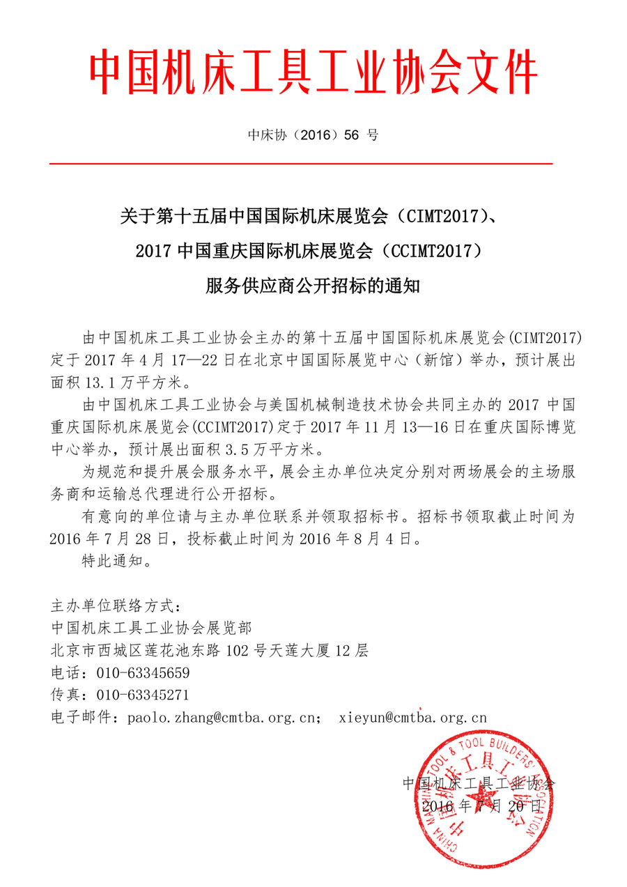 關(guān)于CIMT2017、CCIMT2017服務(wù)供應(yīng)商公開招標(biāo)的通知