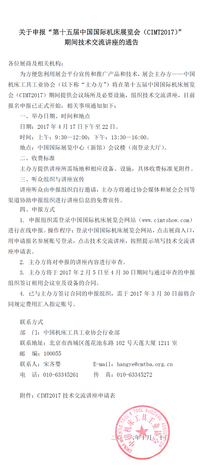 關于申報“第十五屆中國國際機床展覽會(CIMT2017)” 期間技術交流講座的通告