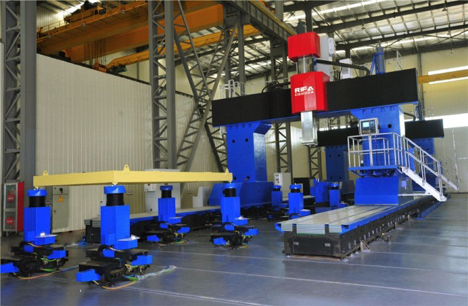 日發航空裝備為此成立專門的研發小組,吸收國外先進的設計理念和裝配技術,專門開發了一款高架橋式結構的鈦合金大扭矩專用加工設備,其主要特點有:(1)設備整體采用高架橋結構,防水性能好,工作臺承載能力大;(2)切削動力頭采用國外成熟的高溫合金專用五軸頭;(3)X軸采用雙驅同步實現重心驅動,具備高動態響應性;(4)橫梁采用高剛性、四導軌熱對稱箱中箱結構;(5)方滑枕采用高剛性包絡式四導軌結構;(6)設備占地面積小,相當于傳統動臺龍門的3/5。