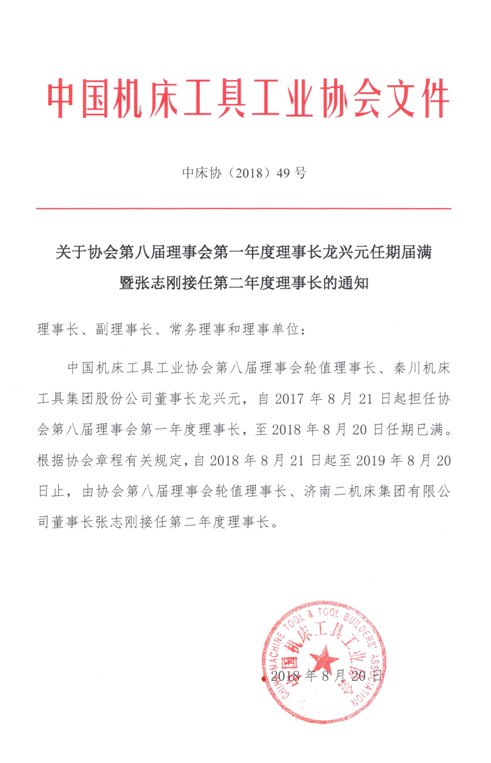 關于協會第八屆理事會第一年度理事長龍興元任期屆滿暨張志剛接任第二年度理事長的通知
