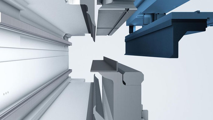 機床還配置了激光角度測量裝置,保證折彎角度正確。兩側的楔形壓邊模可以非常輕松地生產帶有內折邊的盒子。兩側壓邊模沿斜面往下運動并內收,到加工位置再回到原始位置,避免模具與內折邊之間發生碰撞。