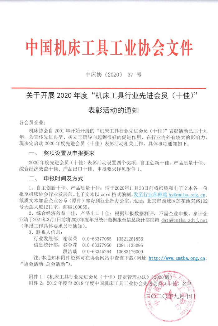關于開展2020年度機床工具行業先進會員(十佳)表彰活動的通知