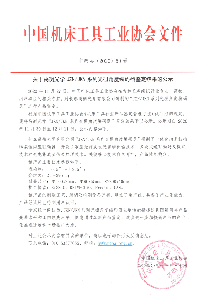 關于禹衡光學JZN/JKN系列光柵角度編碼器鑒定結果的公示